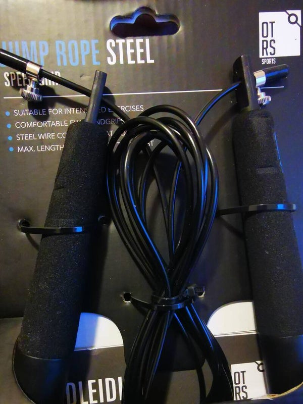 Alleen bij ons krijgt u een moderne *verstelbare (staal draad met plastic erom heen) springtouw van stevige kwaliteit erbij.
